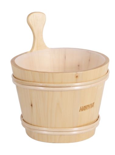 Cebrzyk drewniany z wkładką z tworzywa sztucznego Harvia. Pojemność 7 litrów. Na cebrzyku wypalone jest logo Harvia.