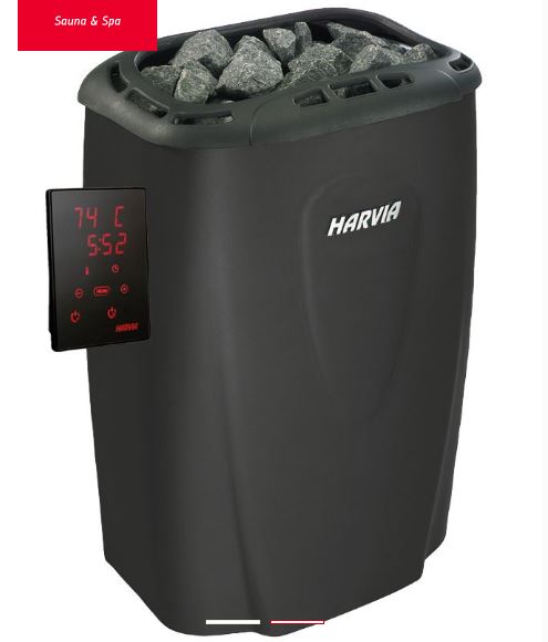 Opatentowany przez Harvię najnowszy sterownik elektroniczny dołączany do pieca ułatwia ustawianie żądanej temperatury z dokładnością nawet do 1 stopnia C. Atrakcyjny jest  kształt sterownika i jego minimalna grubość.