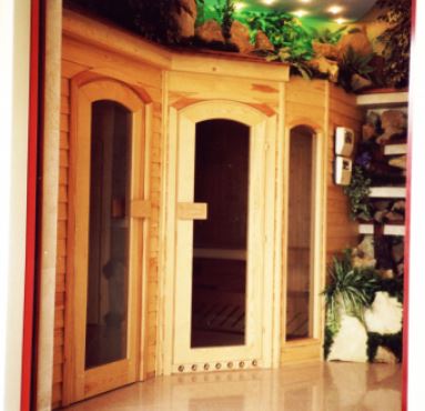 Zdjęcie pokazuje szyby zespolone łukowe duże zastosowane w drzwiach i oknach kabiny saunowej.