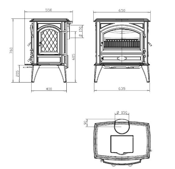 Dane techniczne: wydajność cieplna: - nominalna - 9 kW, - maksymalna - 11 kW, paliwo:suche drewno liściaste, podłączenie do przewodu kominowego: 150 mm (góra lub tył piecyka), materiał wykonania: żeliwo wysokiej jakości, długość polan: do 50 cm,wysokość czoła: 800 mm, szerokość: 740 mm, głębokość: 420 mm, waga: 160 kg, sprawność 78%