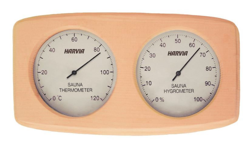 Termohigrometry dwutarczowe Harvia. Jedna tarcza pokazuje temperaturę w kabinie sauny, druga wilgotność. Są wykonane na drewnie, tarcze zegarów osłonięte są szklaną osłoną.